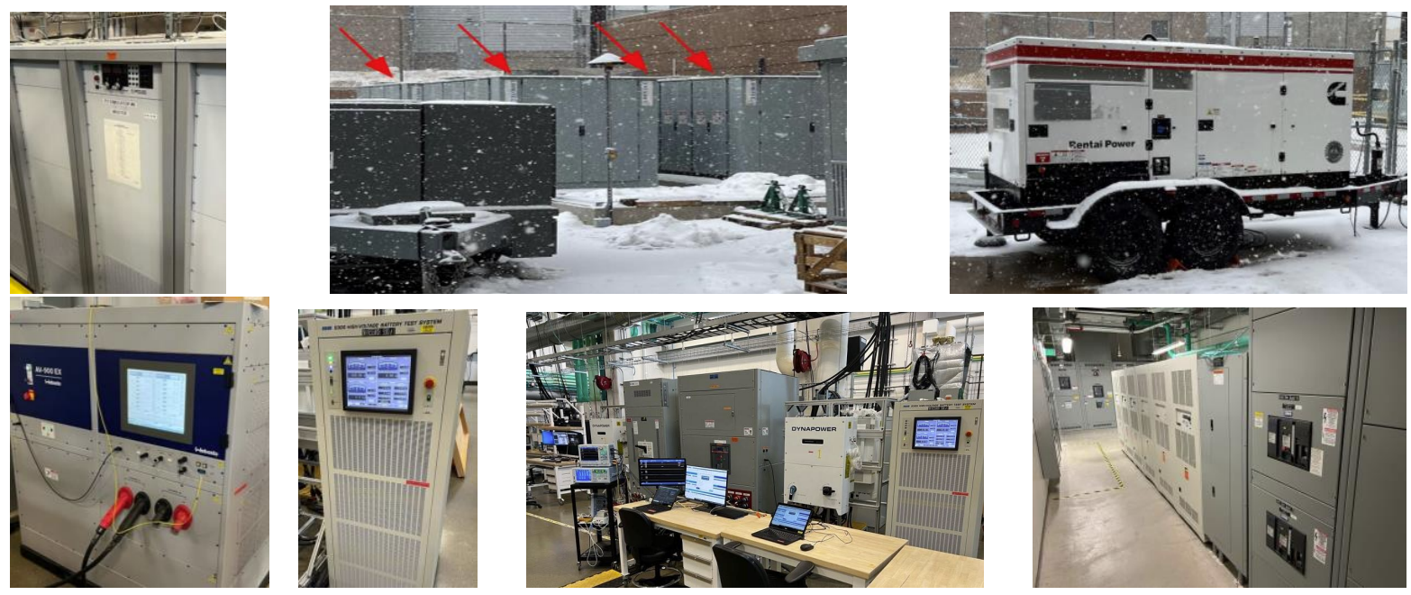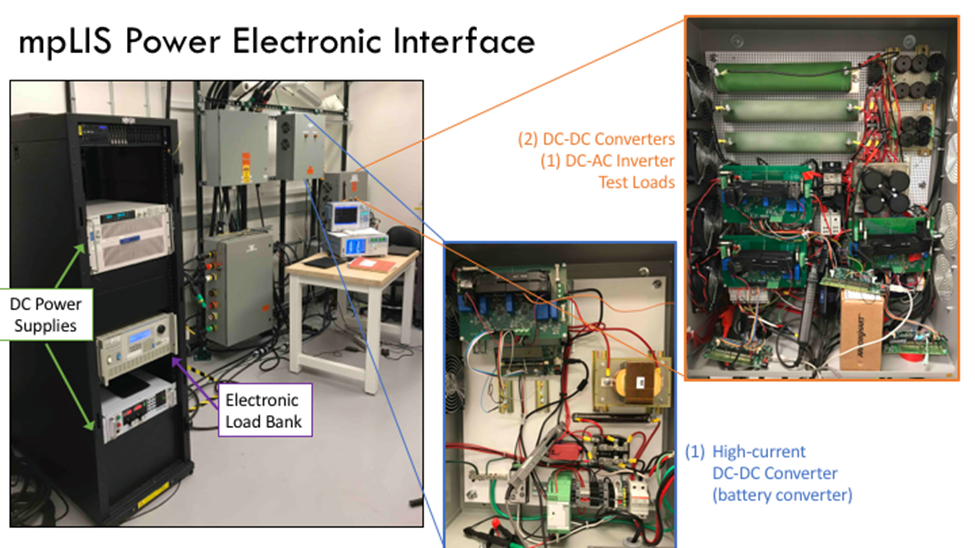 Figure 6 DC supplies (left), AC electronic load bank (left), battery DC-DC converter (center), ac and dc test loads (right), PV and DC source DC-DC converters (right), and inverter (right) used for mpLIS testing